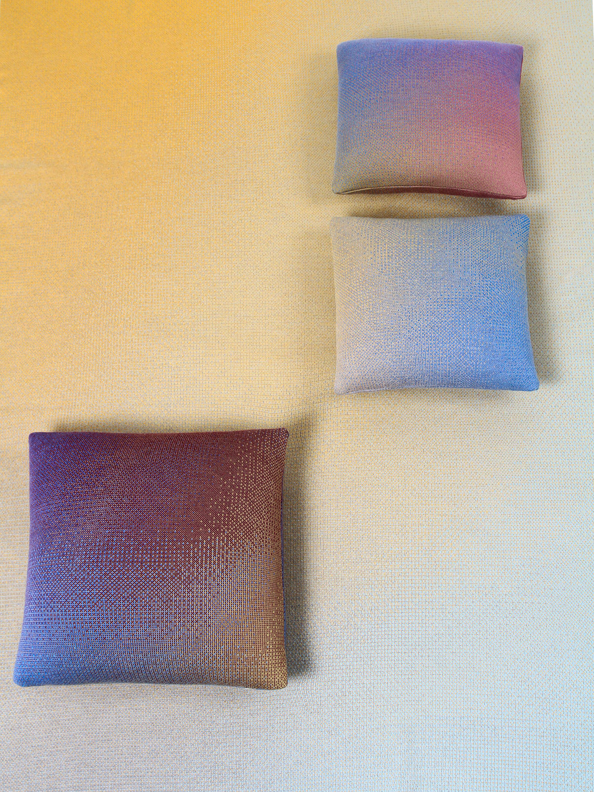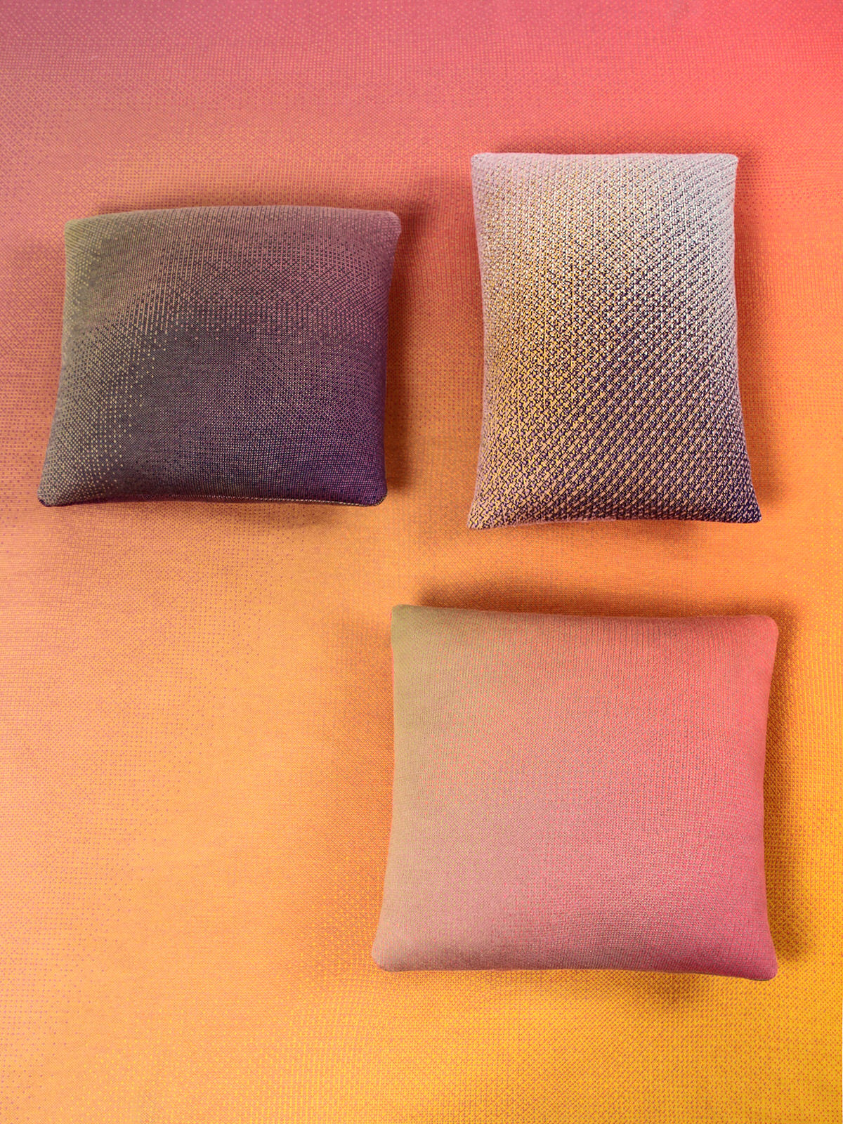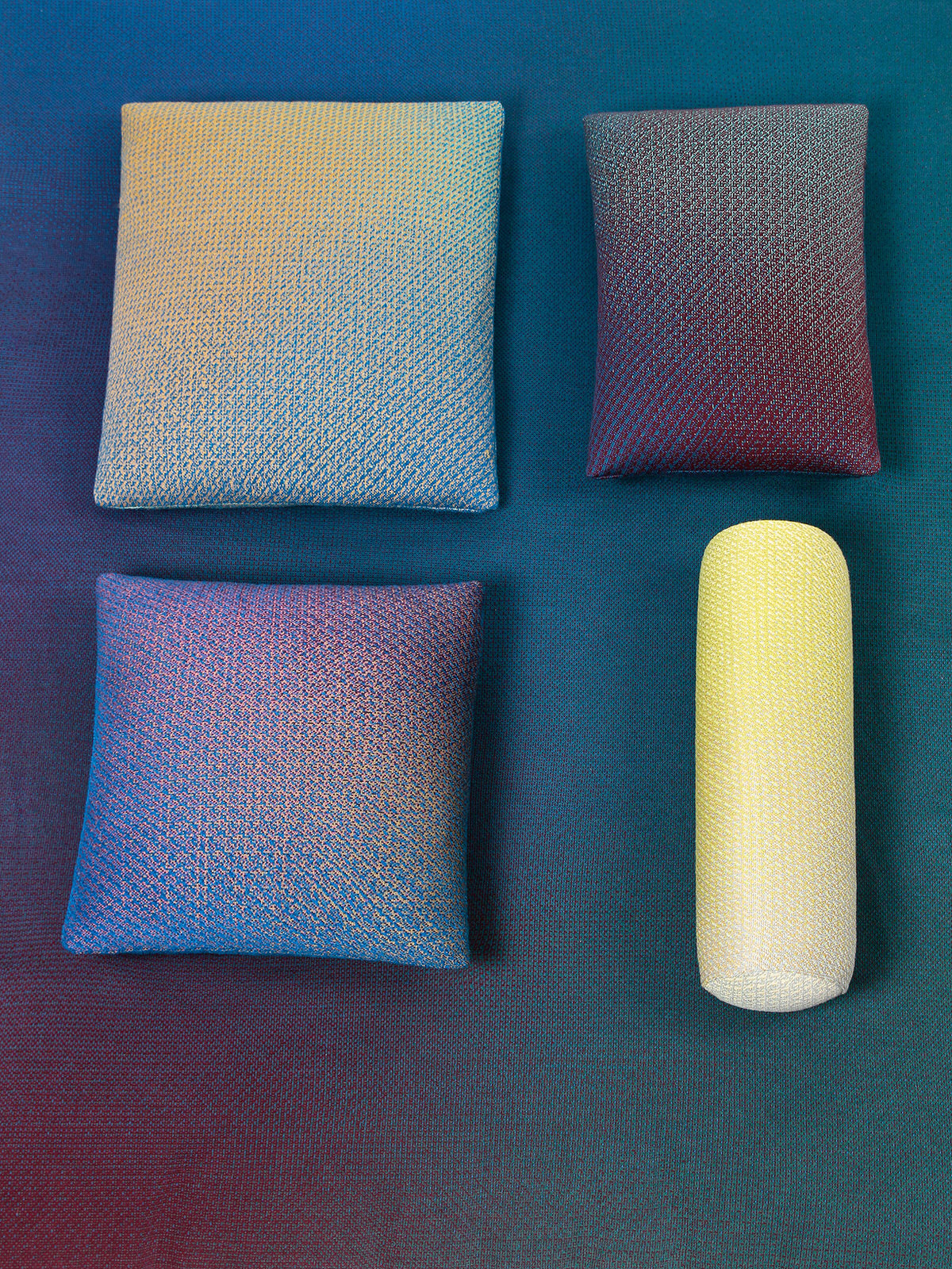 El comportamiento dinámico del color es una característica importante de estos textiles. El diseño Merino Plaid Rabat, combina un azul celeste fresco con un ámbar cálido a la luz del sol, que luego se atenúa con una sombra gris terrosa. Al tirarlo en un sofá, las capas fluidas ponen los lados de diferentes colores uno al lado del otro. En uso, las piezas de punto tienen un potencial altamente adaptable a su entorno, que provoca un vínculo emocional especial.