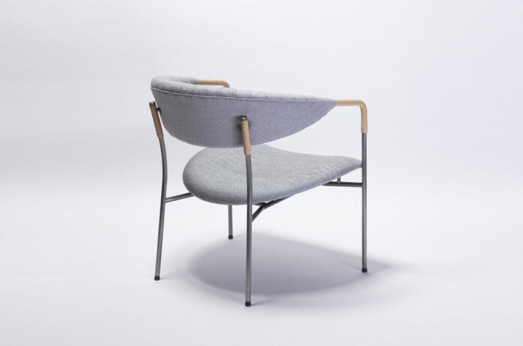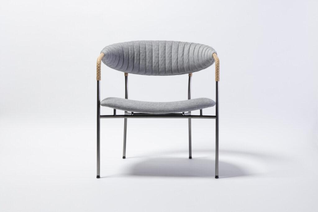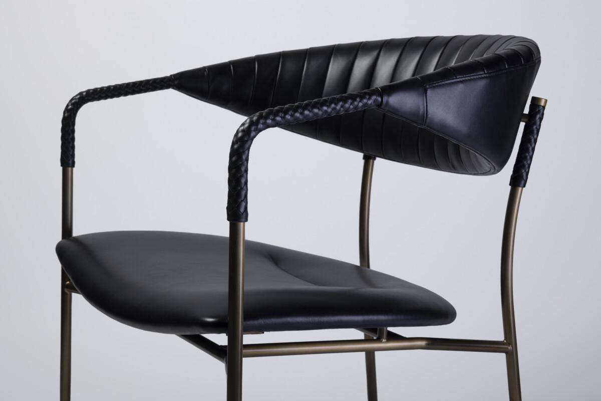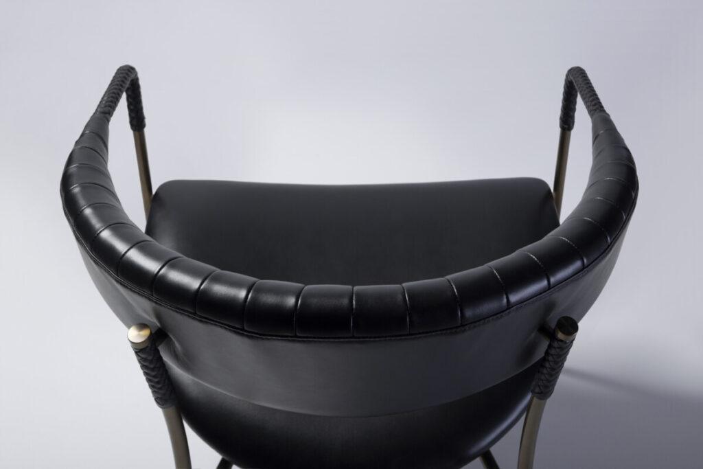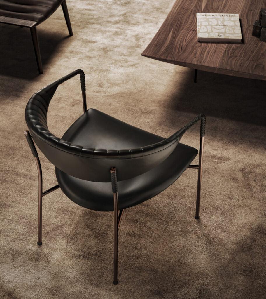 Su estructura curva de acero —disponible en negro y en seis refinados acabados, incluido el distinguido Hairline Antique Gray— sostiene un respaldo ergonómico y un asiento acogedor, tapizados en tela o cuero, con más de 60 opciones de color para personalizar al máximo la pieza.