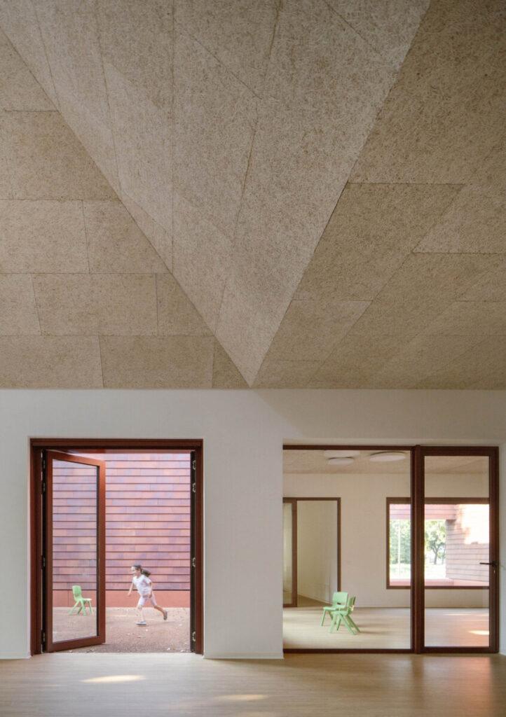 Como casas alrededor de la plaza de un pueblo, las aulas también miran hacia el interior, interactuando a través de un ágora central, un espacio compartido para el juego y el aprendizaje informal. Aquí, la mirada se dirige hacia el jardín, cruzando aulas y patios, creando relaciones continuas entre los espacios.
