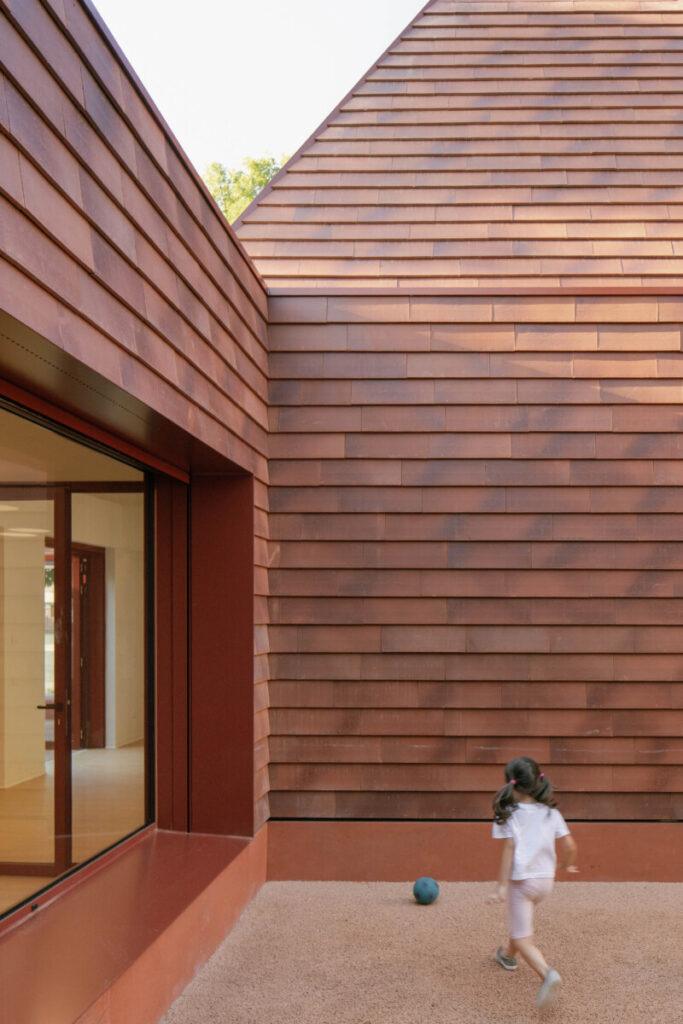 Su forma identifica tres aulas, que se distinguen como excepciones volumétricas dentro de una piel continua de terracota, evocando la antigua tradición de la construcción en arcilla y los techos de teja inclinada.