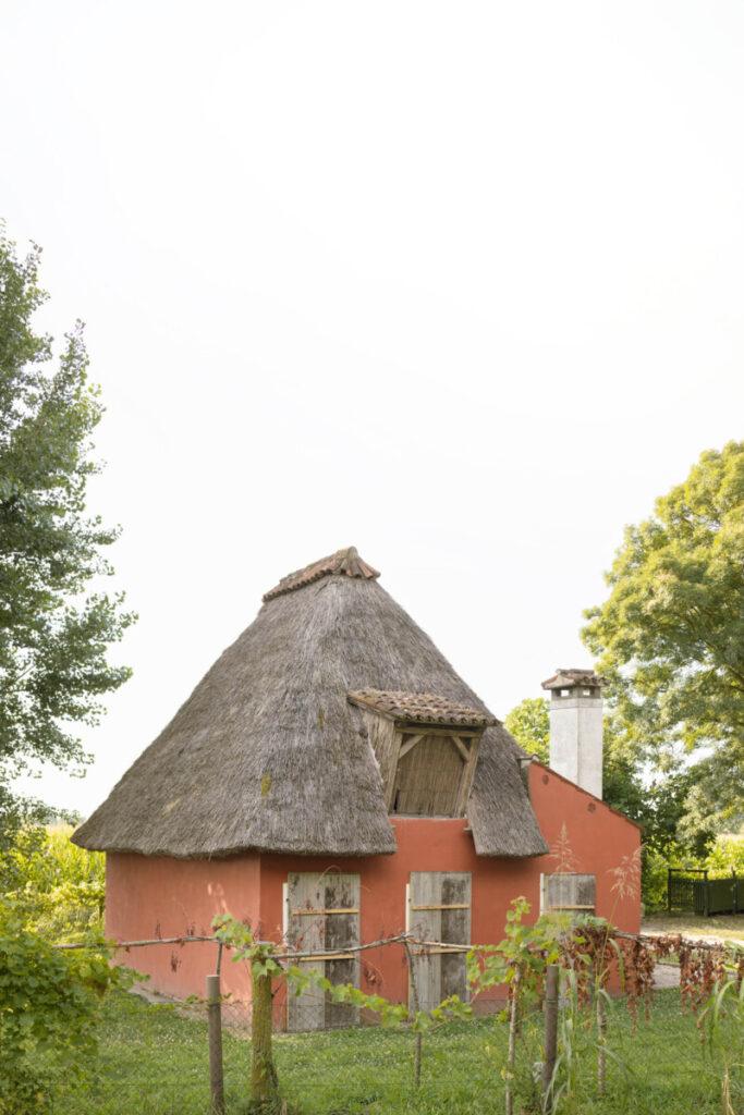 Finalmente, gira hacia arriba, expandiéndose hacia una claraboya cenital. El sol marca el paso del tiempo como un reloj de sol, rozando el techo de madera texturizada; un eco silencioso y material de los techos de paja del Casoni.