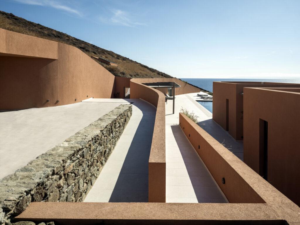 El complejo Olen se extiende sobre una parcela costera con forma de anfiteatro, caracterizada por una pronunciada pendiente hacia el sur y vistas panorámicas del mar Egeo. El principal reto del proyecto consistió en satisfacer requisitos funcionales complejos respetando la morfología del terreno.
