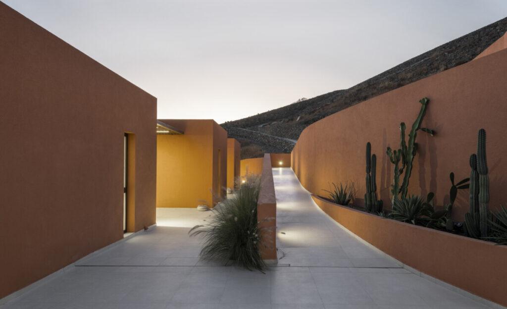 En el punto más alto se despliega el Plano: un espacio común para todos los residentes. La alineación de un muro de contención arqueado crea una sensación de abrazo, sirviendo simultáneamente como conducto para la circulación vertical (rampas y escaleras) y como elemento que integra una estructura subterránea que alberga espacios habitables y comunes. El muro define la distribución de la terraza, el Plano, donde se ubican tres apartamentos independientes para huéspedes.