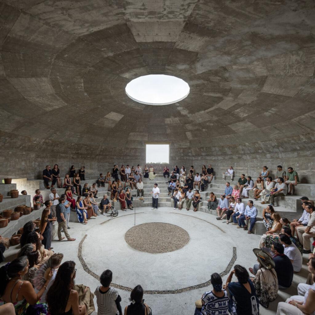 Un óculo abre el espacio central al cielo e inunda de luz el interior cavernoso, mientras que aberturas adicionales en el perímetro inferior permiten la ventilación natural. Una plataforma y un portal en la parte superior de las escaleras ofrecen vistas panorámicas del océano, más allá de la vegetación autóctona. El volumen tridimensional se curva hacia adentro en su base para minimizar el contacto del pabellón con el suelo, preservando al máximo el paisaje natural y permitiendo el crecimiento del guayacán, planta autóctona.