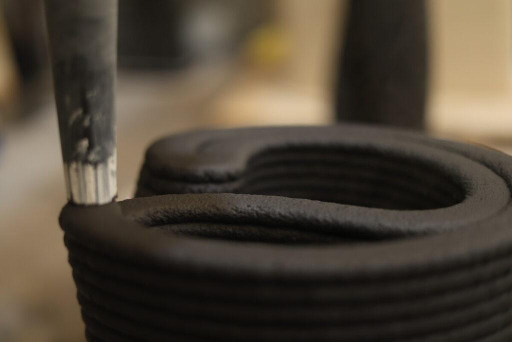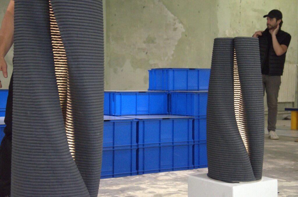 El proceso de fabricación es una coreografía de precisión técnica. Según explica Carot, las piezas se crean mediante un sistema de flujo continuo. Esta técnica impone desafíos físicos severos: la lámpara no puede realizarse en etapas; si se corta el proceso, las capas no se ligan adecuadamente. El peso propio del material y el tiempo de secado exigen una precisión absoluta para evitar que la estructura colapse durante la impresión. Esta complejidad se traduce en una estética honesta, donde las capas de material extruido permanecen visibles como registro del proceso tecnológico.